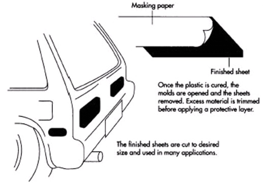 - Any excess material, or flash, is trimmed off the edges, and masking paper or plastic film is applied to the surface of the finished sheets for protection during handling and shipping. The paper or film is often marked with the material's brand name, size, and handling instructions. Conformance with applicable safety or building code standards is also noted.